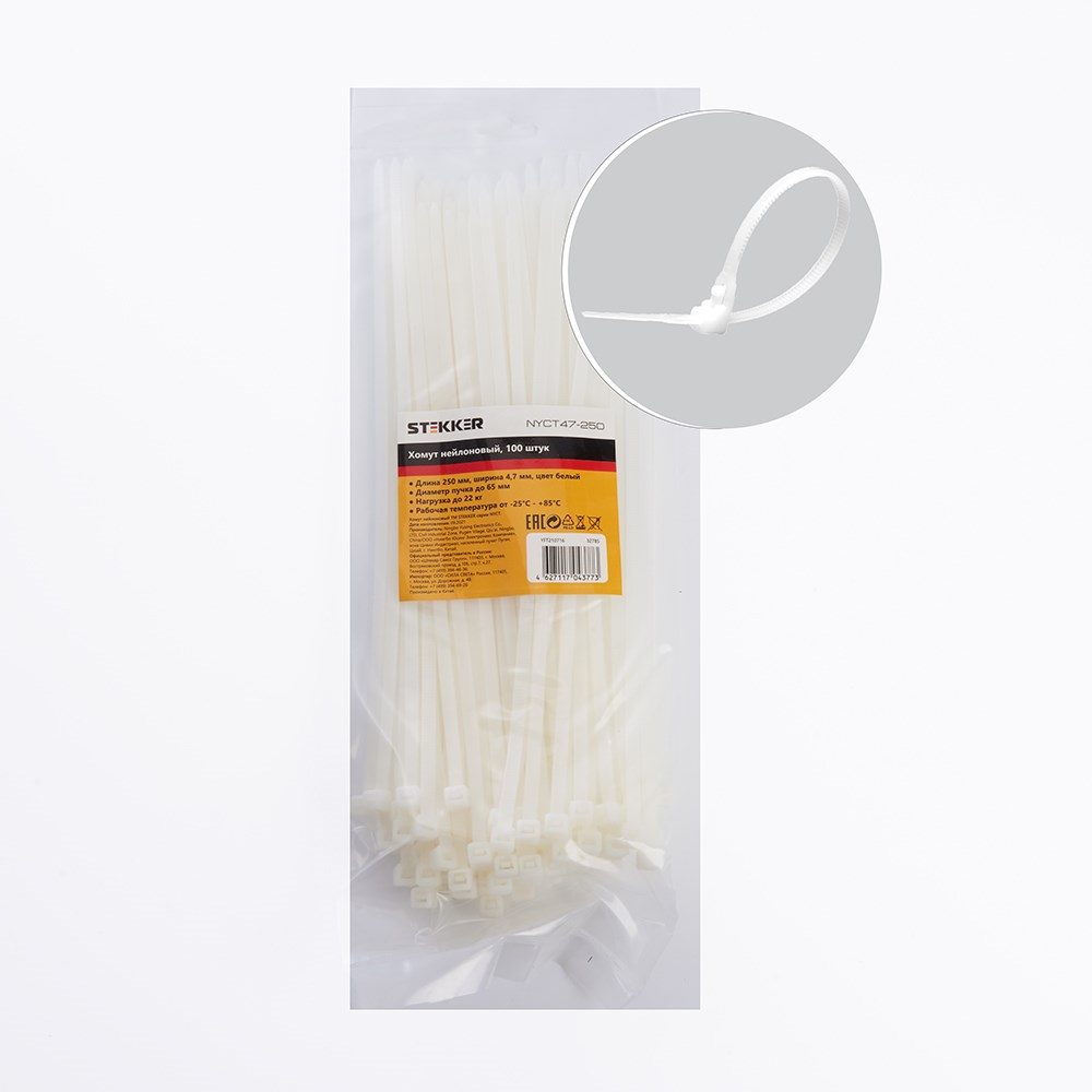 Хомут нейлоновый STEKKER NYCT47-250 4,7х250 мм, d пучка max 65 мм, нагрузка 22кг, белый, упаковка 100 шт