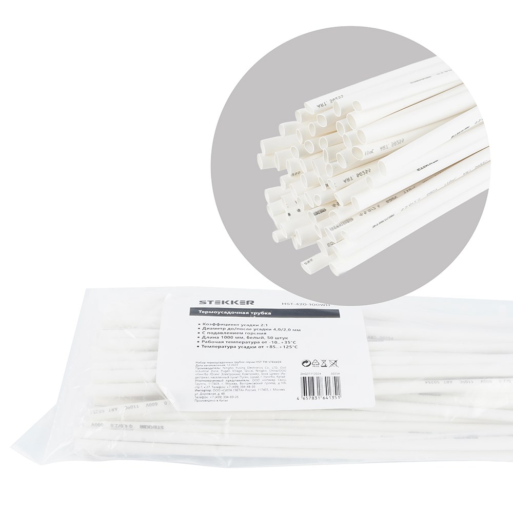 Термоусадочная трубка STEKKER 4,0/2,0 мм, длина 100 см., усадка 2:1, белый HST-420-100WH