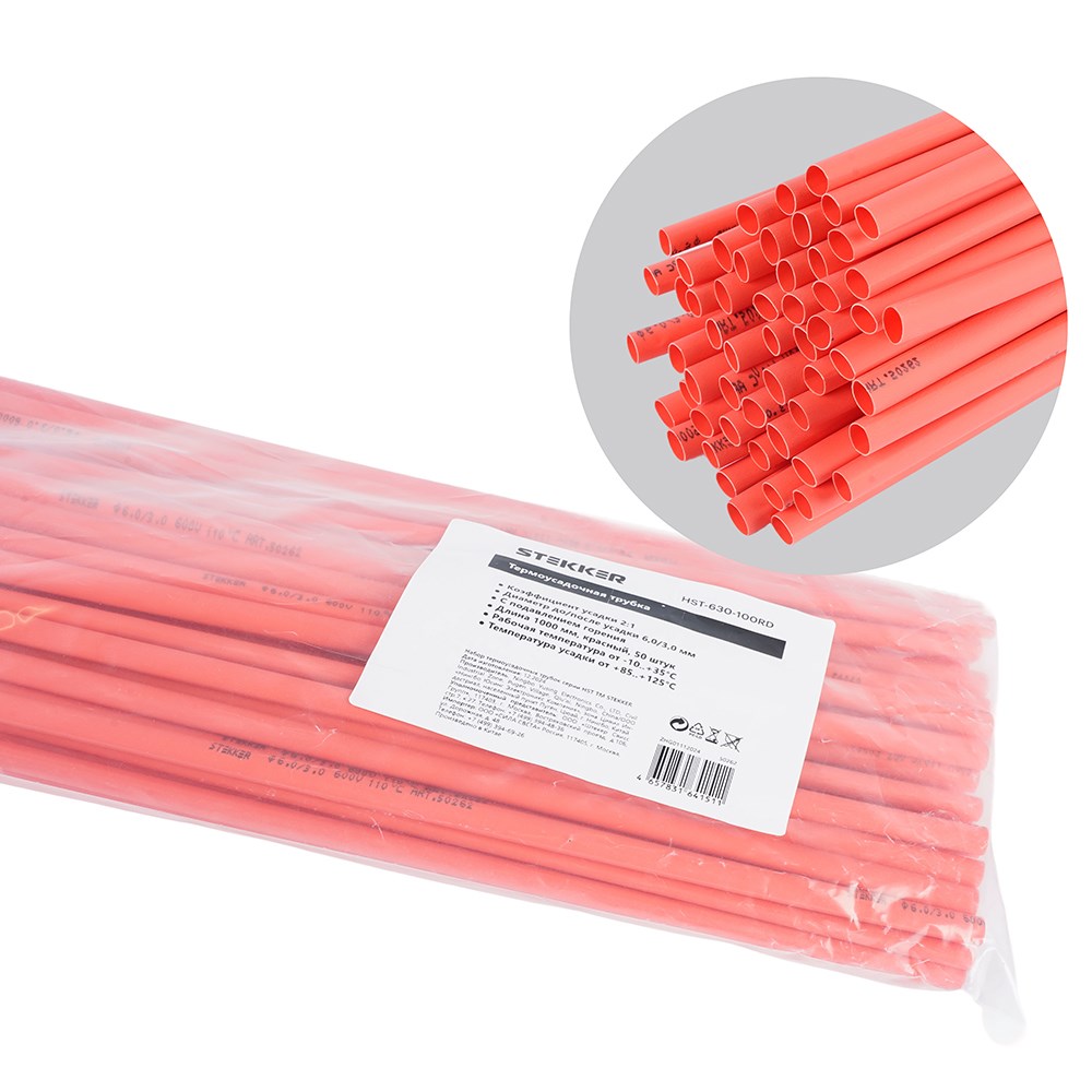 Термоусадочная трубка STEKKER 6,0/3,0 мм, длина 100 см., усадка 2:1, красный HST-630-100RD