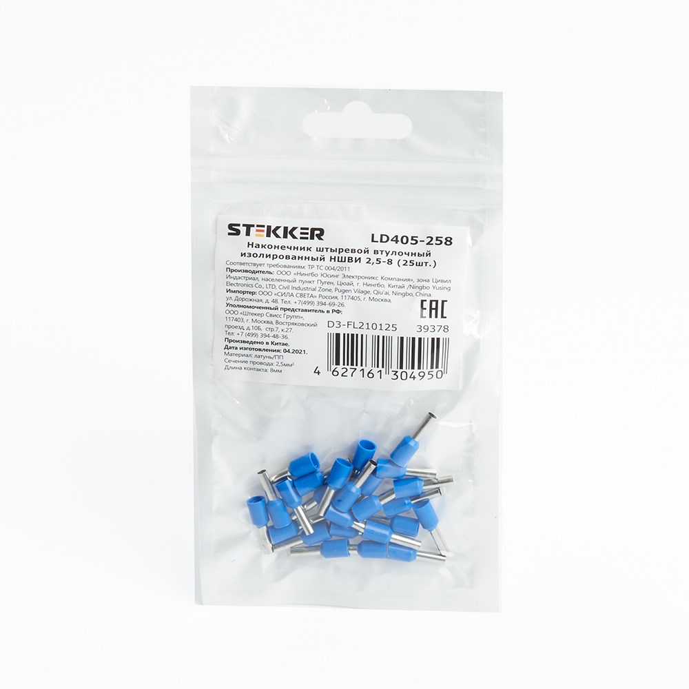 Наконечник штыревой втулочный изолированный НШВИ 2,5-8, LD405-258 (DIY упаковка 25 шт)